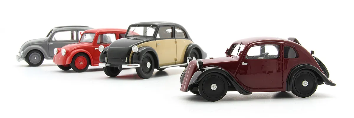 Specialty model car manufacturer AutoCult from Germany has released a special collectors’ set entitled “The Road to the People’s Car”, including four 1:43 scale models of pre-VW cars and prototypes and a book. The models include the 1931 Mercedes-Benz 120H prototype, 1933 Standard Superior Type 2 (based on the patents of Josef Ganz), 1933 Tatra V570 prototype and NSU Type 32 prototype.